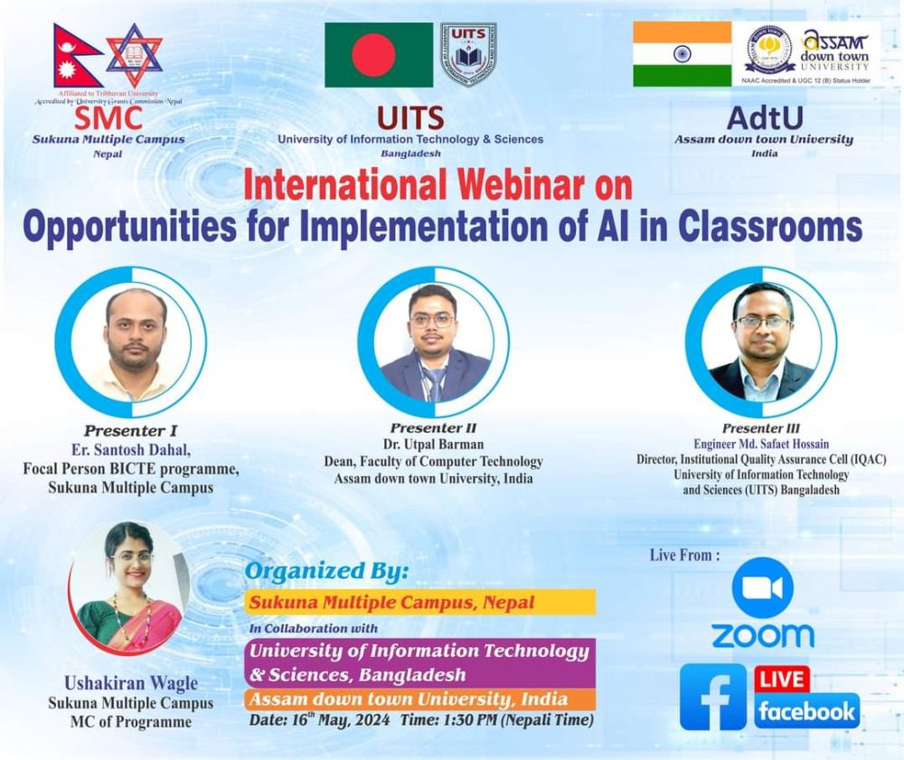 सुकुना बहुमुखी क्याम्पसको आयोजना तथा आसाम डाउन टाउन युनिभर्सिटी, भारत र युनिभर्सिटी अफ इन्फर्मेसन टेक्नोलोजी एण्ड साइन्सेज, बङ्गलादेशको सहकार्यमा त्रिपक्षीय वेबिनार सम्पन्न भएको छ । 'कक्षाकोठामा कृत्रिम बुद्धिमत्ता कार्यान्वयनका लागि अवसर' (Opportunities for implementation of AI in the Classroom) विषयमा सम्पन्न उक्त वेबिनारमा सुकुना बहुमुखी क्याम्पसको तर्फबाट वि.आई.सि.टी.ई. कार्यक्रमका फोकल... पुरा पढ्नुहोस