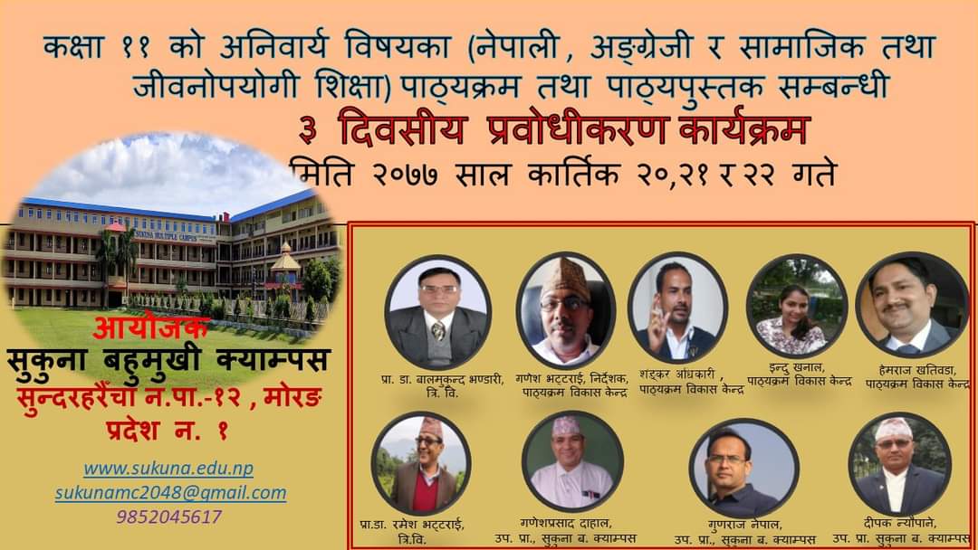 कक्षा ११ र १२ सञ्चालन गरेका प्रदेश नं १ र २ का विद्यालय, क्याम्पस तथा अन्य शैक्षिक संस्थाहरूको प्रतिनिधिमूलक सहभागितामा सुकुना क्याम्पसमा भर्चुअल प्रबोधीकरण कार्यक्रम सम्पन्न भएकाे छ । कार्तिक २० देखि २२ गतेसम्म भएको कार्यक्रममा ११ र १२ मा अनिवार्य अङ्ग्रेजी अध्यापन गर्ने ३०० शिक्षकहरू सहभागी थिए । नेपाल सरकार,... पुरा पढ्नुहोस