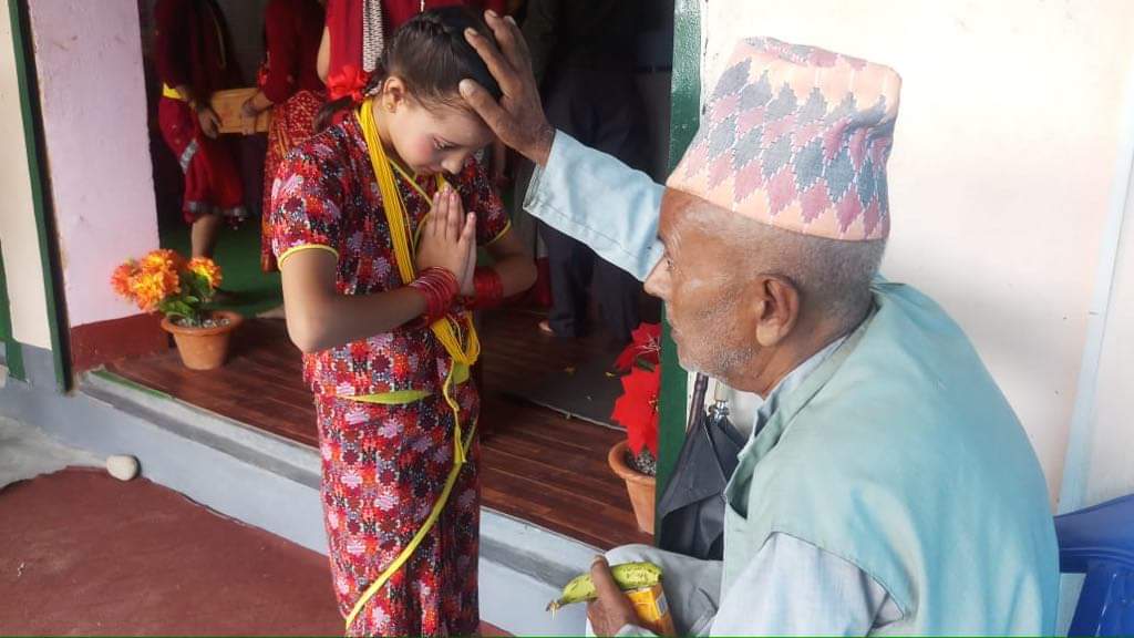 जेष्ठ नागरिकबाट आशीर्वाद लिँदै र फलफुल दिंँदै गुरुकुलका विद्यार्थीले मनाए वाल दिवस