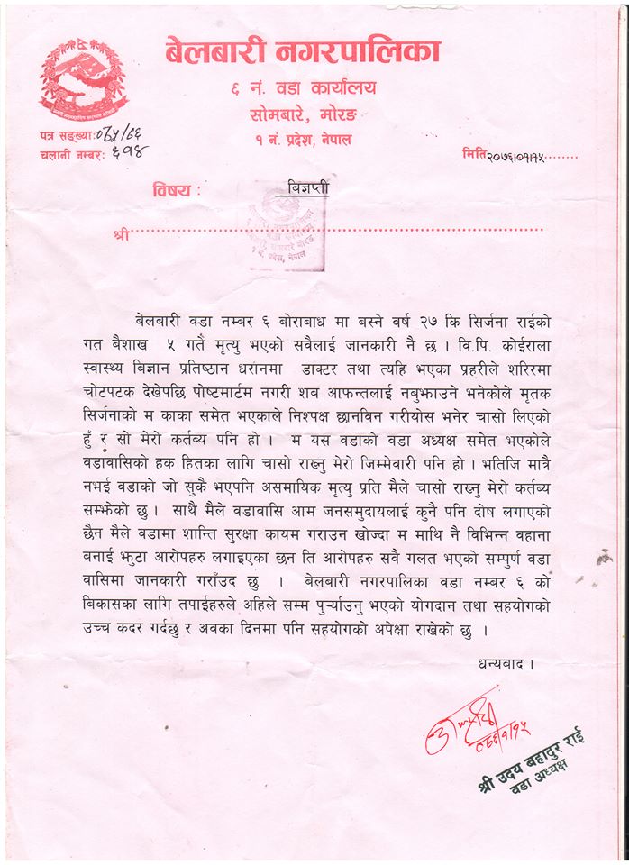 मोरङको बेलबारी ६ कसेनीकी २७ बर्षिया सिर्जना राई (मुना) को मृत्युको बिषयलाइ लिएर आफुलाइ बदनाम गर्न खोजिएको भन्दै बेलबारी नगरपालिका वडा नम्बर ६ का वडाध्यक्ष उदयवहादुर राईले बिज्ञप्ति निकालेर प्रतिबाद गरेका छन् । बिज्ञप्तिमा राइले सिर्जनाको गत वैशाख ५ गते विपि कोइराला स्वास्थ्य विज्ञान प्रतिष्ठानमा उपचारको क्रममा मृत्यु भएको र डाक्टर... पुरा पढ्नुहोस