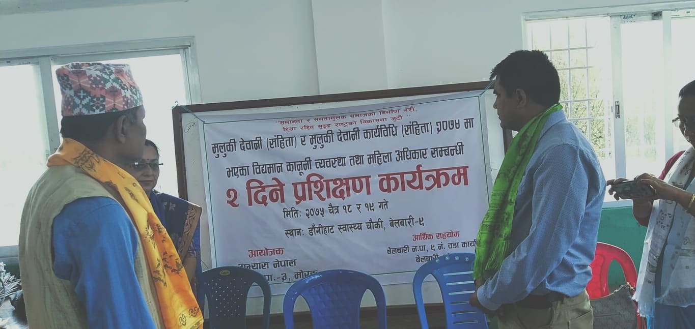 बेलबारीमा मुलुकी देवानी संहिता र महिला अधिकार सम्बन्धी दुइ दिने प्रशिक्षण