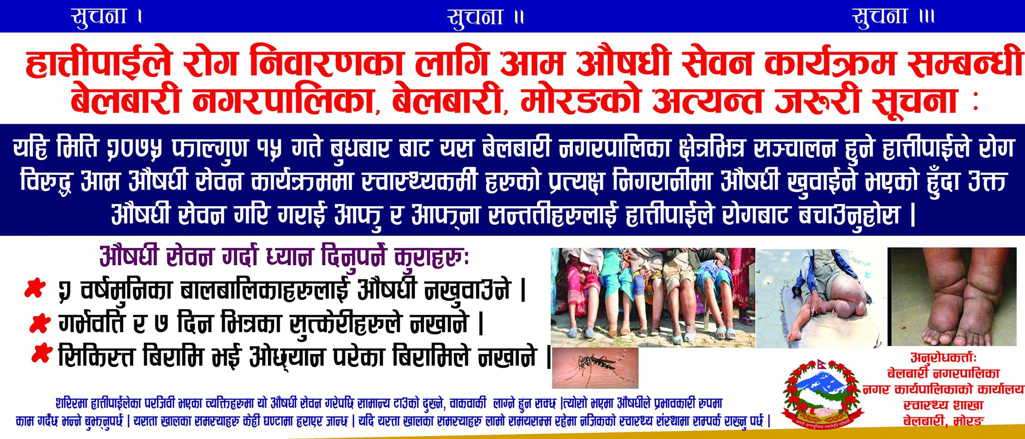 हात्तीपाईले रोगमुक्त नगर बनाउनमा लागि मोरङको बेलबारी नगरपालिकाले आगामी फागुन १५ देखि आठौ पटक हात्तीपाईले रोग विरुद्धको औषधी खुवाउने अभियान सुचारु गर्ने भएको छ । हाती पाईले विरुद्ध अभियान चलाईरहेपनि केहि ब्यात्तीलाई लक्षण देखा परेको नगरपालिकानले जनाएको छ । टोल टोलमा गएर औषधी खुवाउछौ मेयर ज्ञानेन्द्र सुवेदीले भने रोग लाग्नु... पुरा पढ्नुहोस