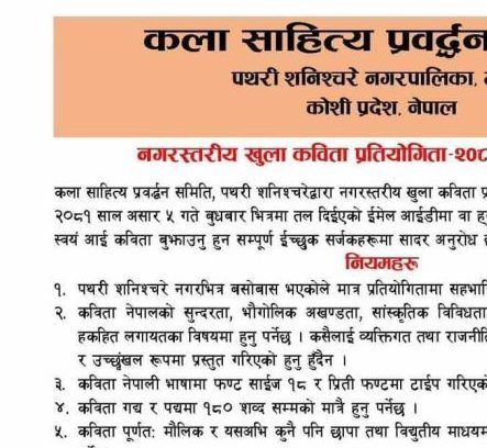 मोरङको पथरी शनिश्चरेमा नगरस्तरीय खुला कविता प्रतियोगिता - २०८१ हुने भएको छ। कला साहित्य प्रवर्द्धन समिति, पथरी शनिश्चरेद्वारा नगरस्तरीय खुला कविता प्रतियोगिताको आयोजना हुन लागेको हो। यही असार ०८ गते शनिवार सो प्रतियोगिताको प्रथम चरणका लागि छनौटमा परेका उत्कृष्ट २० कविहरूले आ आफ्ना कविताहरू वाचन गरी प्रतियोगितामा सहभागिता जनाउने छन्।... पुरा पढ्नुहोस