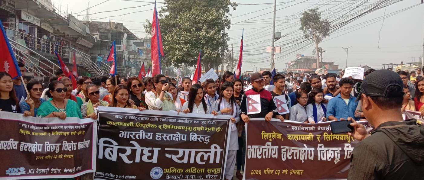 बेलबारी, माेरङ/ भारतले कालापानी, लिपुलेक, लिम्पियाधुरा लगायतकाे भूमिलाई समेटेर नयाँ राजनतिक नक्सा सार्वजनिक गरेकाे विषयलाई लिएर मोरङ बेलबारीका बासिन्दा आन्दाेलित भएका छन् । युवा जागरण नेपालकाे सक्रियतामा भेला भएका विभिन्न पेसा व्यवसाय, विद्यार्थी, राजनीतिक दलमा आवद्ध युवाहरुले र्यालीकाे आयाेजना गरेर भारतकाे हेपाहा प्रवृतिविरुद्ध आवाज वुलन्ध पारेका हुन । "कालापानी हाम्राे... पुरा पढ्नुहोस