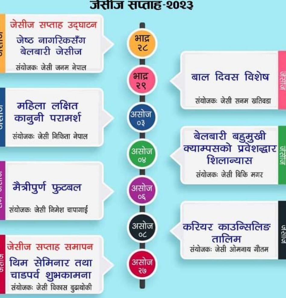 बेलबारी जेसीज वर्ष २०२३ ले विभिन्न कार्यक्रमसहित जेसीज सप्ताह मनाउने भएको छ । सप्ताह अन्तरगत विभिन्न क्षेत्रका व्यक्तित्वहरुलाई समेटी विभिन्न विधामा कार्यक्रम संचालन गरिने भएको हो । सामाजिक, विकास, महिला, बालबालिका र युवाहरुको क्षमता तथा दक्षता विकास गर्न जेसिज सप्ताहका कार्यक्रम महत्वपूर्ण हुने बेलबारी जेसिजका अध्यक्ष बिपिन आचार्यले बताए ।... पुरा पढ्नुहोस